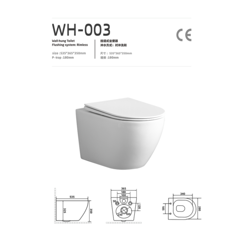 CE Certificated Ceramic Wall Mounted Rimless Toilet With Slim UF Seat Cover Factory-Direct Cost Efficiency TLH-1048W-S OEM for ERTH, THABAT, Saudi Arabia